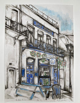 The monoprinting technique I use involves drawing onto paper that is lying directly on an inked surface which produces an image on the other side. I use this technique to draw an outline of the building and then go back into it with pens and ink. The result is a detailed and textural image. The picture is made of ink from the original monoprint and the marks applied afterwards.